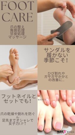 お知らせ, ネイルケア, フットネイル サンダルを履かない季節にも!!フットケア 2026年1月21日 夏はサンダルを履くので、 素足になる機会が多いので、 フットケア/フットネイルをするけど・・・ 冬は靴下やタイツ履くから お手入れしてない・・・ はありませんか??? この間に溜まった 足裏の角質や伸びっぱなしのお爪の長さは、 巻き爪などのトラブルになったり、 ガサガサかかとになってしまったり・・・ トラブルになる事がおおいです!! もうすぐ春になって 素足になる前に、 フットケアをして整えましょー!!