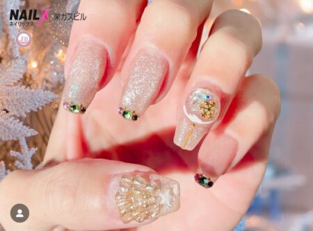 ジェルネイル 大人クリスマスネイル/ちゅるんマグネットワンカラー 2025年12月5日 クリスマスネイルっぽくゴールドのキラキラマグネットワンカラー。 爪先には、グリーン、ピンク、ゴールドのストーンで飾って、クリスマスカラーに… 5本とも同じデザイン◎ポイントアート◎シンプルネイルの中に、さりげく季節を取り入れたクリスマスネイルに!